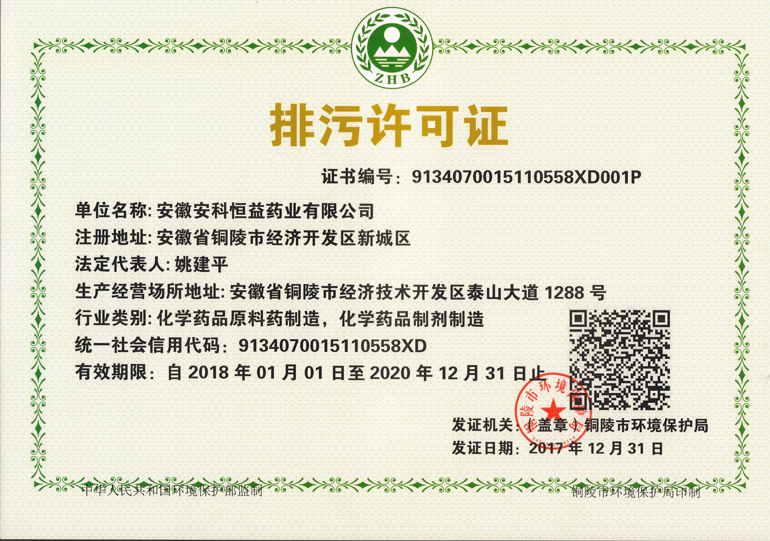 近日,我公司涉及化學(xué)原料藥制造及化學(xué)藥品制劑制造范圍內(nèi)取得銅陵市環(huán)保局頒發(fā)的 “排污許可證”,我公司排污許可證是區(qū)域內(nèi)首批取得的單位,相比原有的排污許可制,本次排污許可制有機銜接環(huán)評制度,整合總量控制制度,強化了對固定污染源實施全過程管理和多污染物的協(xié)同控制,實現(xiàn)對固定污染源的“一證式”管理。據(jù)悉本次的排污許可證載有獨有的二維碼信息,公眾只要掃一下二維碼,企業(yè)的地理位置、生產(chǎn)設(shè)施、排污狀況、執(zhí)行標(biāo)準(zhǔn)、監(jiān)測要求、排污去向等信息就會全部顯示出來,可以非常方便地了解企業(yè)環(huán)保執(zhí)行情況。