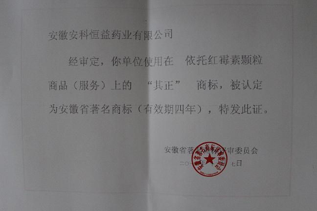 近日,公司收到《2017年安徽省著名商標(biāo)認(rèn)定公告》,公司產(chǎn)品依托紅霉素顆粒其商標(biāo)“其正”經(jīng)安徽省著名商標(biāo)評審委員會評審?fù)ㄟ^,認(rèn)定為“安徽省著名商標(biāo)”。該商標(biāo)是我公司取得的第三件省著名商標(biāo)(前兩件分別是“天井”牌氨咖黃敏膠囊、恒迪克牌頭孢克洛分散片)。