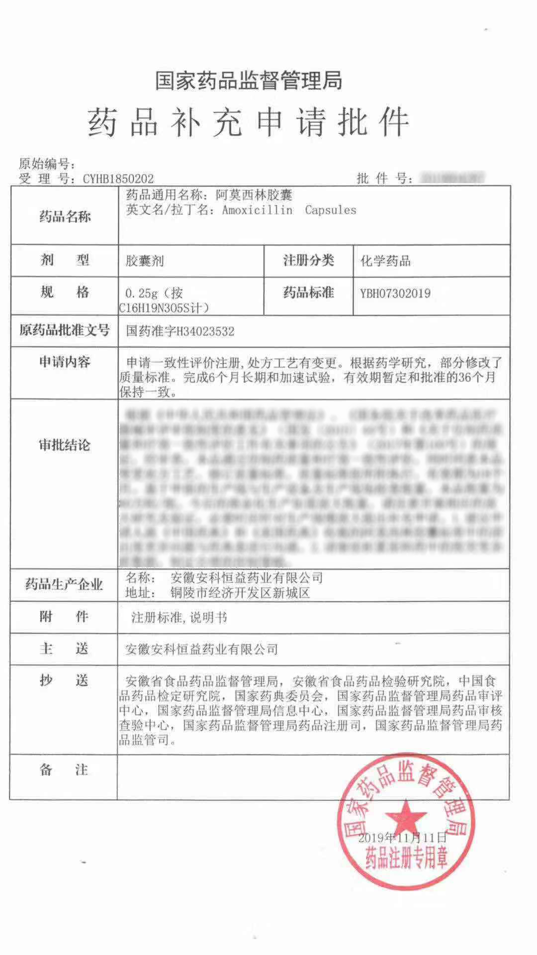 12月2日,安科恒益藥業(yè)收到國家藥品監(jiān)督管理局核準(zhǔn)簽發(fā)的藥品補(bǔ)充申請(qǐng)批件:經(jīng)審查,安徽安科恒益藥業(yè)有限公司阿莫西林膠囊(0.25g)通過仿制藥質(zhì)量和療效一致性評(píng)價(jià)。