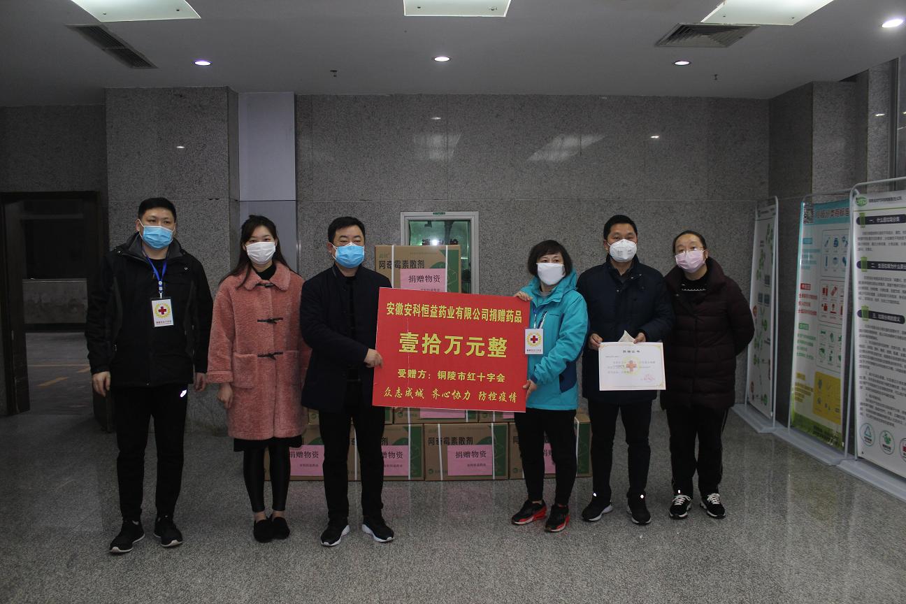 2月11日上午,公司通過銅陵市紅十字會捐贈藥品阿奇霉素散劑4000盒,總價值10萬元,支援銅陵當地新型冠狀病毒肺炎疫情防控工作,為疫情防控貢獻一份自己的力量。銅陵市紅十字會秘書長戴群女士接受捐獻,并向公司代表頒發了《捐贈證書》,對我公司積極承擔社會責任給予了充分的肯定,并表示,市紅十字會將在最快時間內按銅陵市疫情防控指揮中心的調度指令,將防疫藥品送到疫情最需要的地方。
