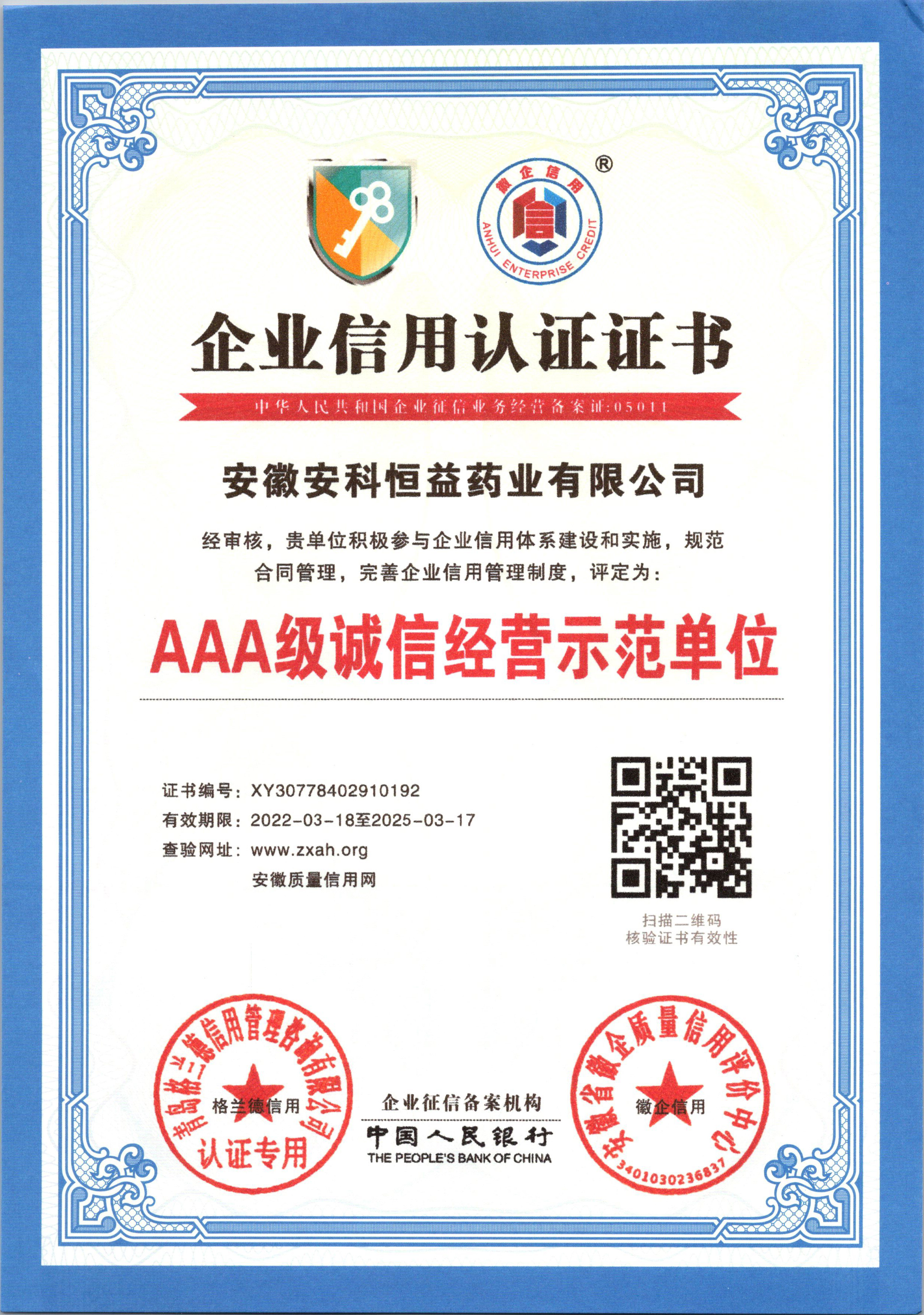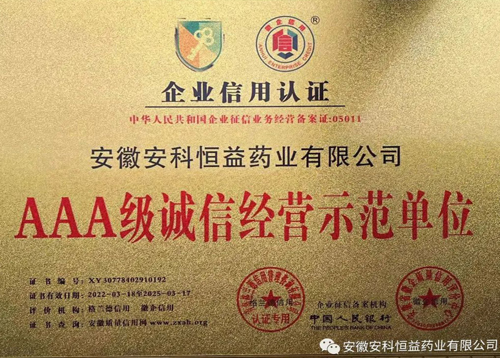 經(jīng)安徽省徽企信用評(píng)價(jià)有限公司、安徽省徽企質(zhì)量信用評(píng)價(jià)中心評(píng)審,綜合公司市場(chǎng)活動(dòng)、經(jīng)營(yíng)狀況、信用管理等方面記錄,評(píng)定企業(yè)信用等級(jí)為“AAA級(jí)誠(chéng)信經(jīng)營(yíng)示范單位”,并頒發(fā)了獎(jiǎng)牌及證書(shū)。
