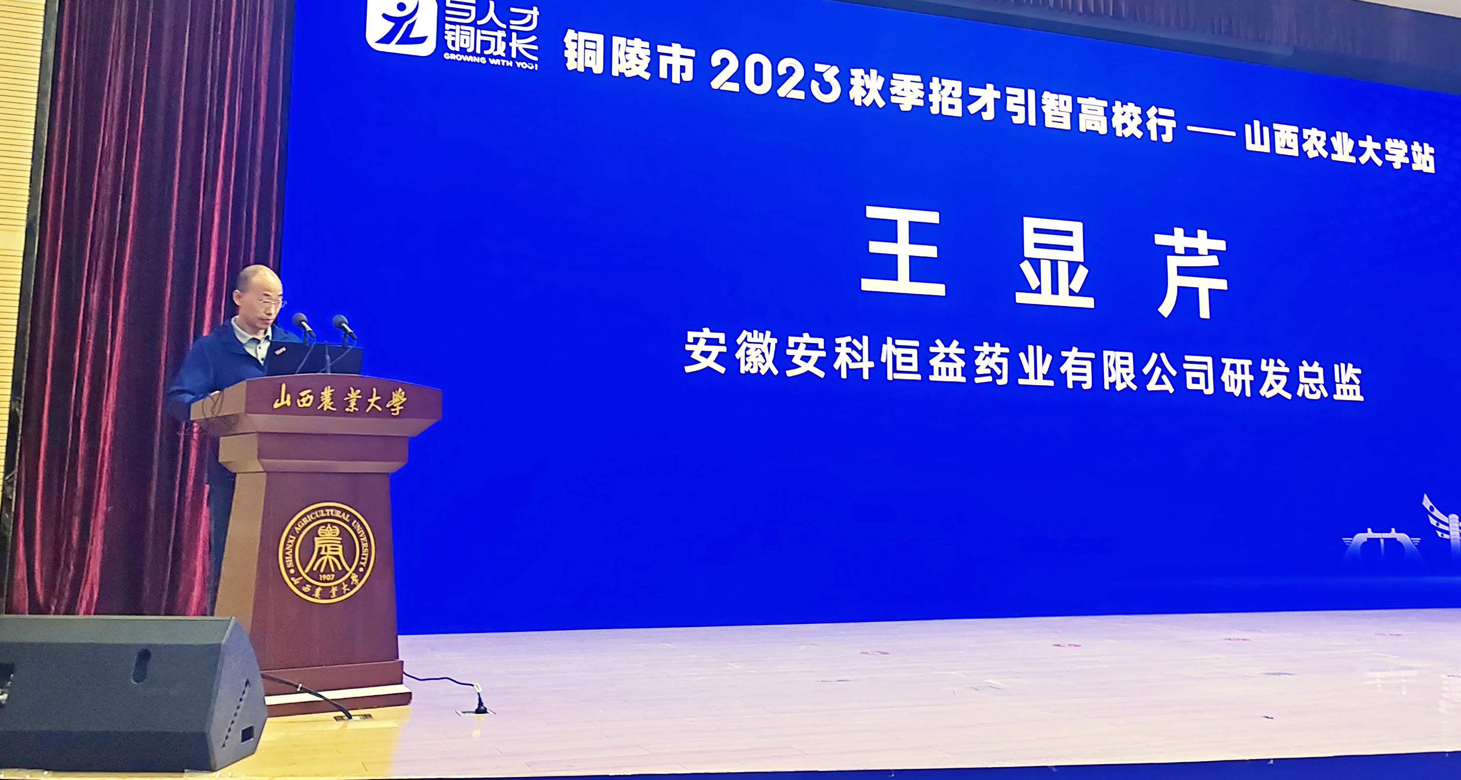 會前,參會人員集中觀看了銅陵市人才工作宣傳片。在隨后的招才引智宣講活動中,李衛祥致辭,鄭剛作市情介紹,市人社局、市農業農村局分別作人才政策和農業產業鏈及崗位需求推介,我公司作為2家重點企業之一進行了宣講,研發總監王顯芹先生對安科生物集團以及安科恒益藥業的規模、主要品種、未來發展、招聘崗位向與會的畢業生們重點進行了推薦、宣講。