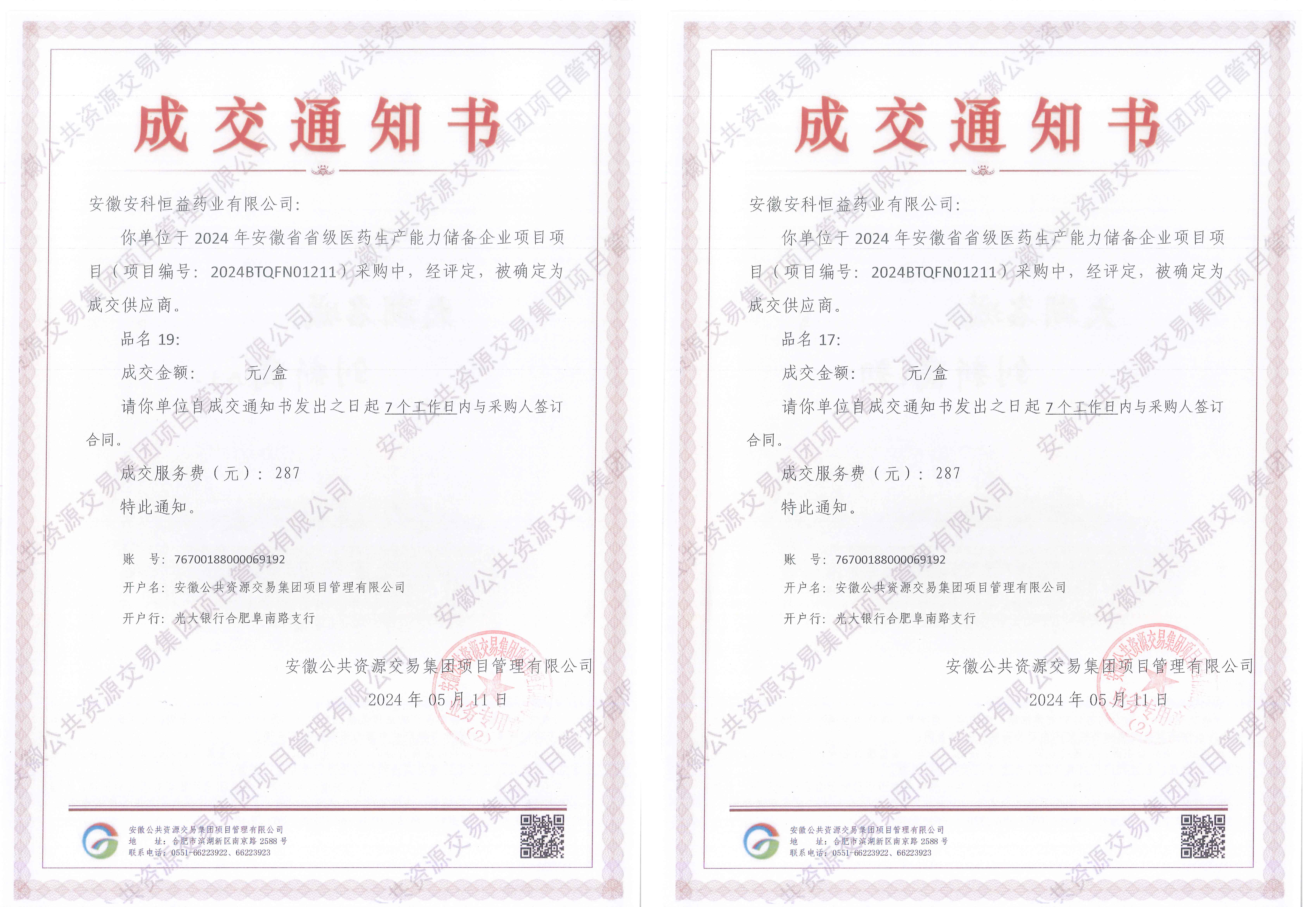 經綜合評定,我公司阿莫西林膠囊、頭孢拉定膠囊兩個品種進入名單,成功中標,公司確定為安徽省省級醫藥生產能力儲備企業項目供應商之一,中標品種簽訂3年服務期限。